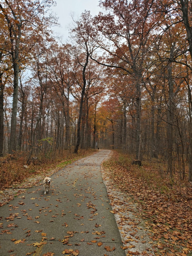 The leaves are almost gone now, soon it will be Hunter’s favorite time of the year—white slushy walks.