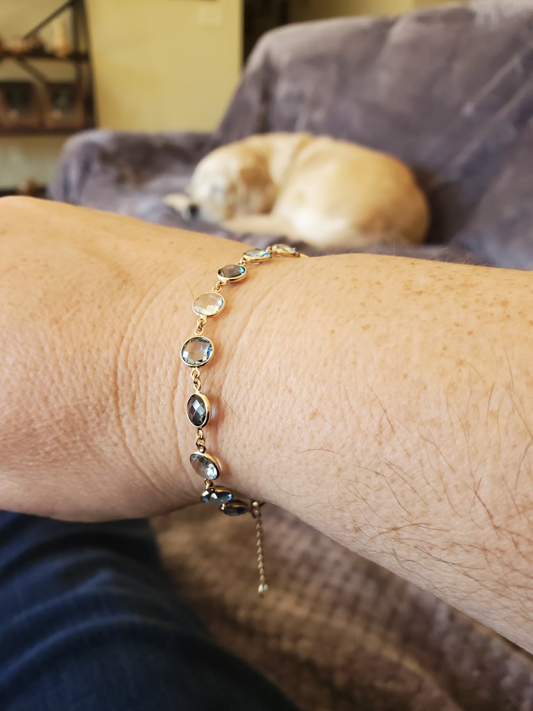 I’ve now lost all the weight that I gained. To celebrate being below my WW weight before Covid hit, Gilbert bought me a beautiful multicolored topazĀ bracelet. I love it. We are trying to do non-food rewards and celebrations. Gilbert’s lost 25 pounds himself. He is looking great.Ā I am down a total of 28 since I started working at losing again.